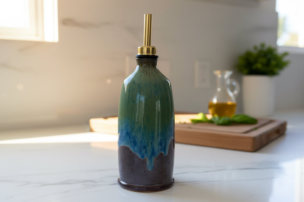 Hand-thrown stoneware vessel with artisanal glaze. One-of-a-kind piece with natural variations. Food-safe glaze; gentle hand-wash recommended. Perfect for the kitchen or bath as a dispenser, pour bottle, or decor.