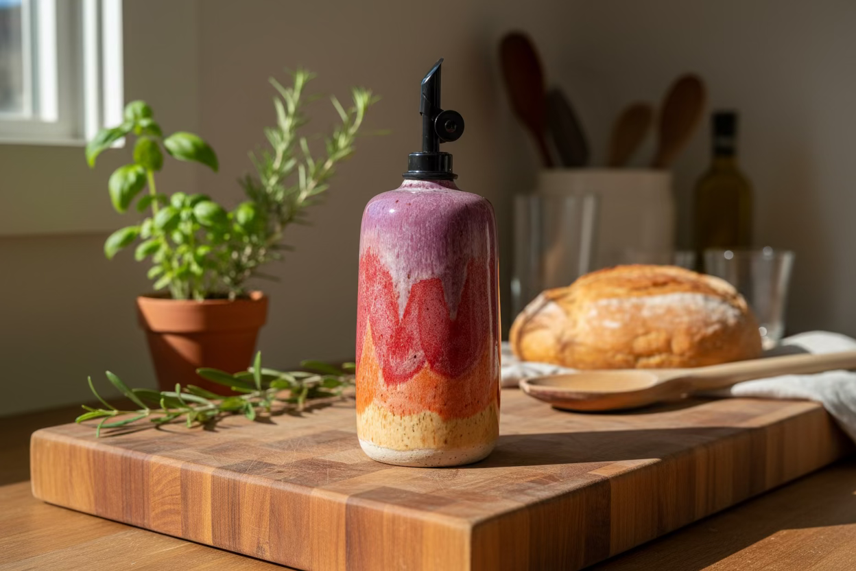 Hand-thrown stoneware vessel with artisanal glaze. One-of-a-kind piece with natural variations. Food-safe glaze; gentle hand-wash recommended. Perfect for the kitchen or bath as a dispenser, pour bottle, or decor.