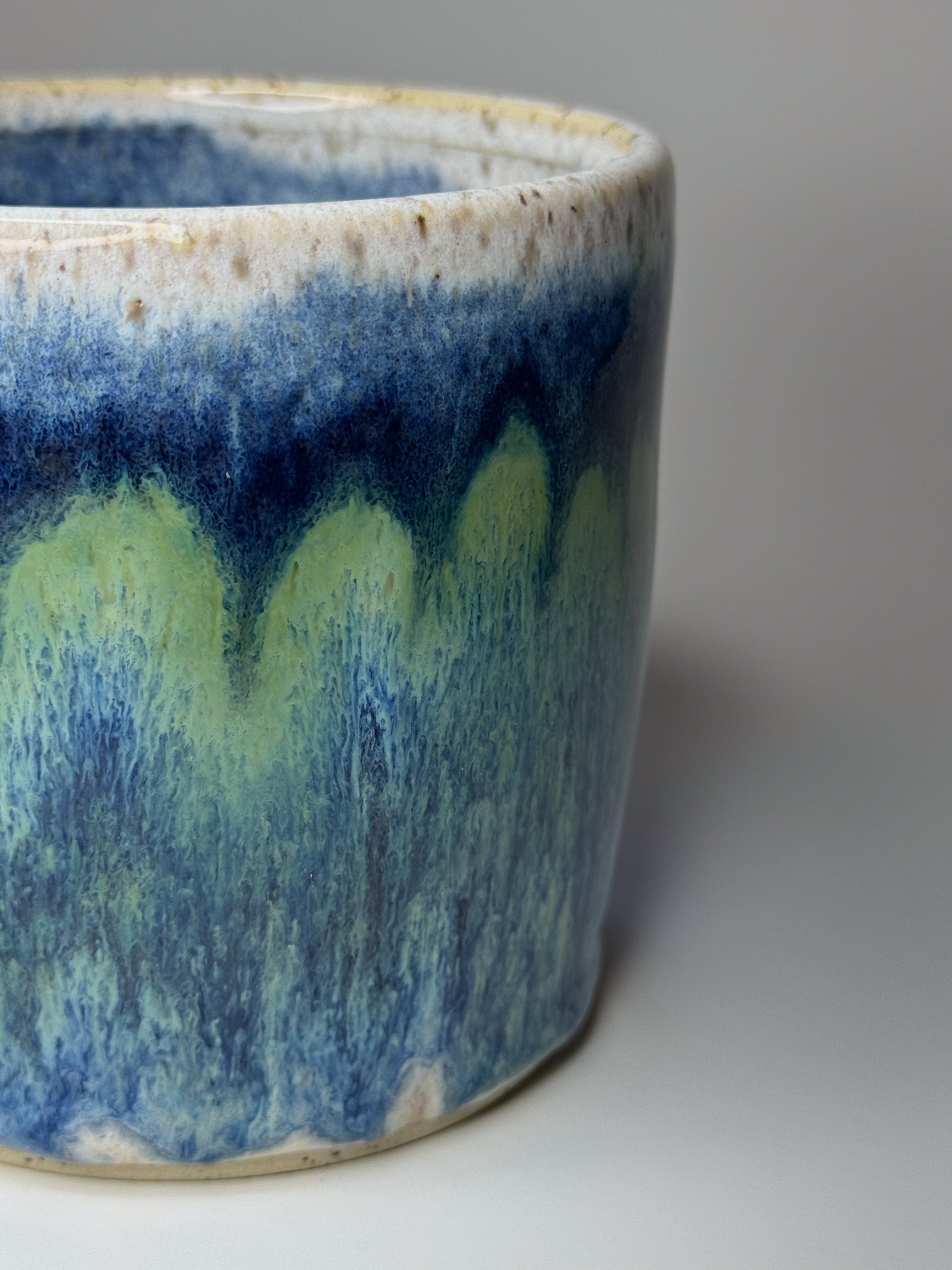 - Finish: Glossy multicolor blue, green, and white glaze.