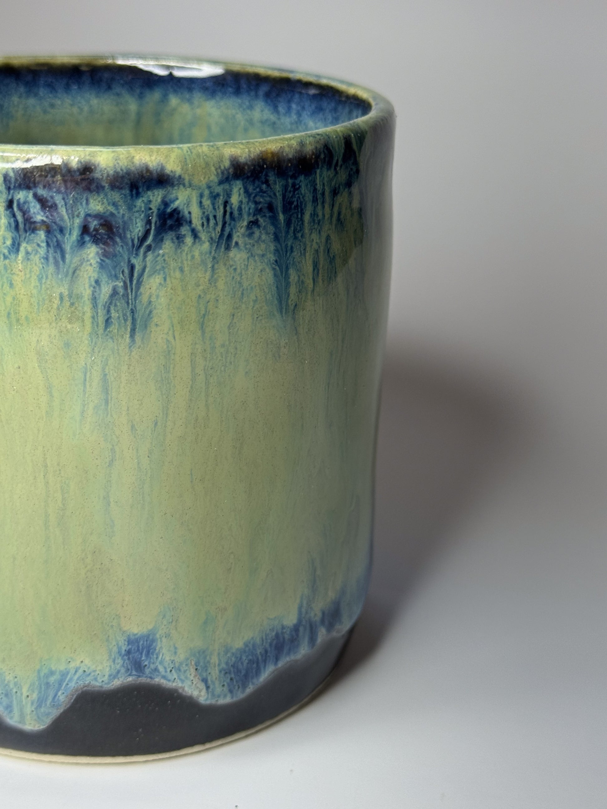 - Finish: Glossy multicolor blue and green glaze.