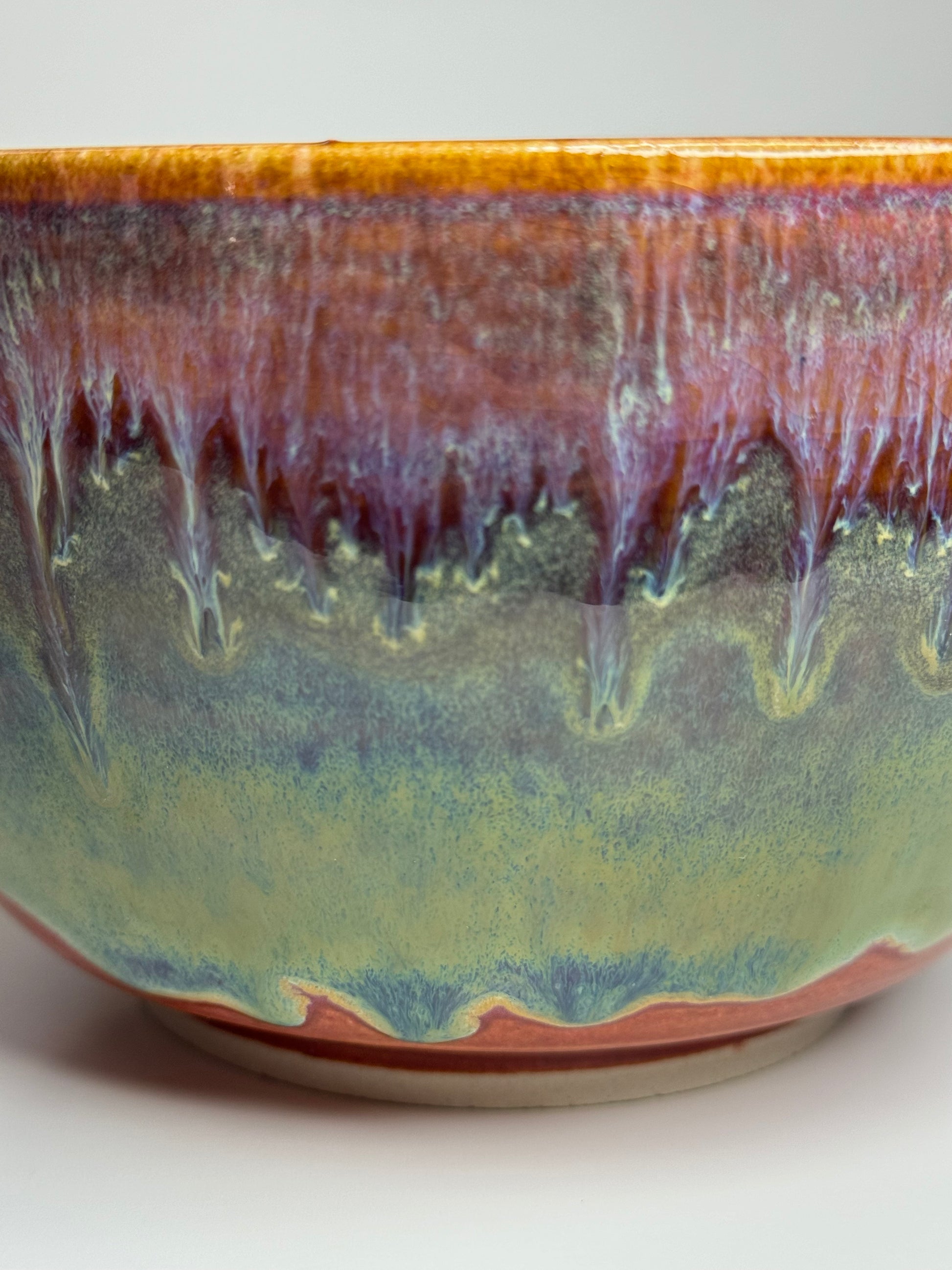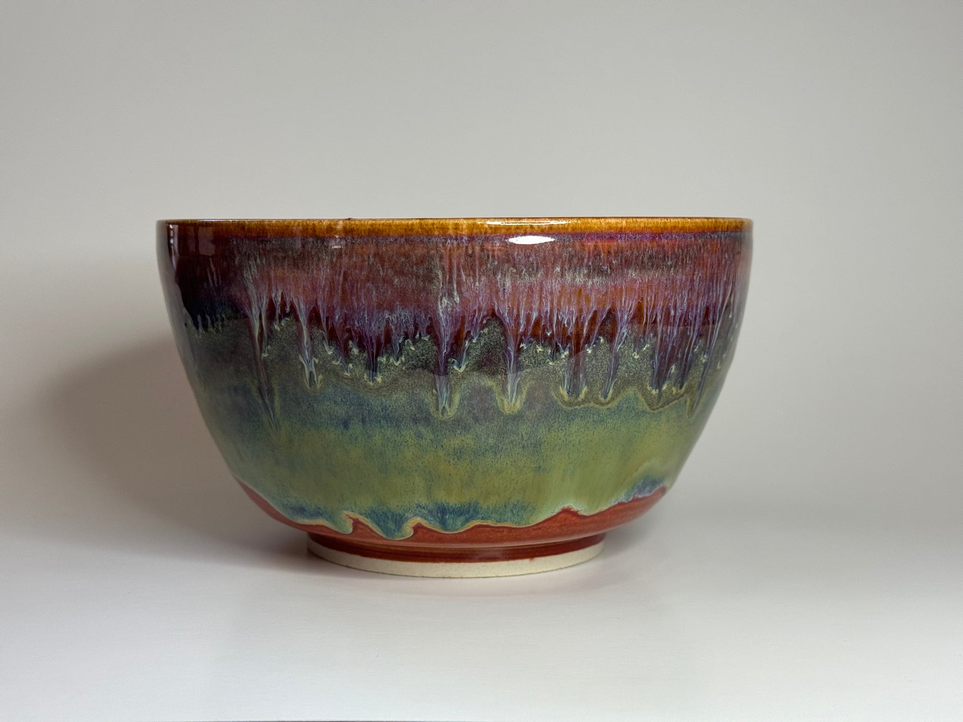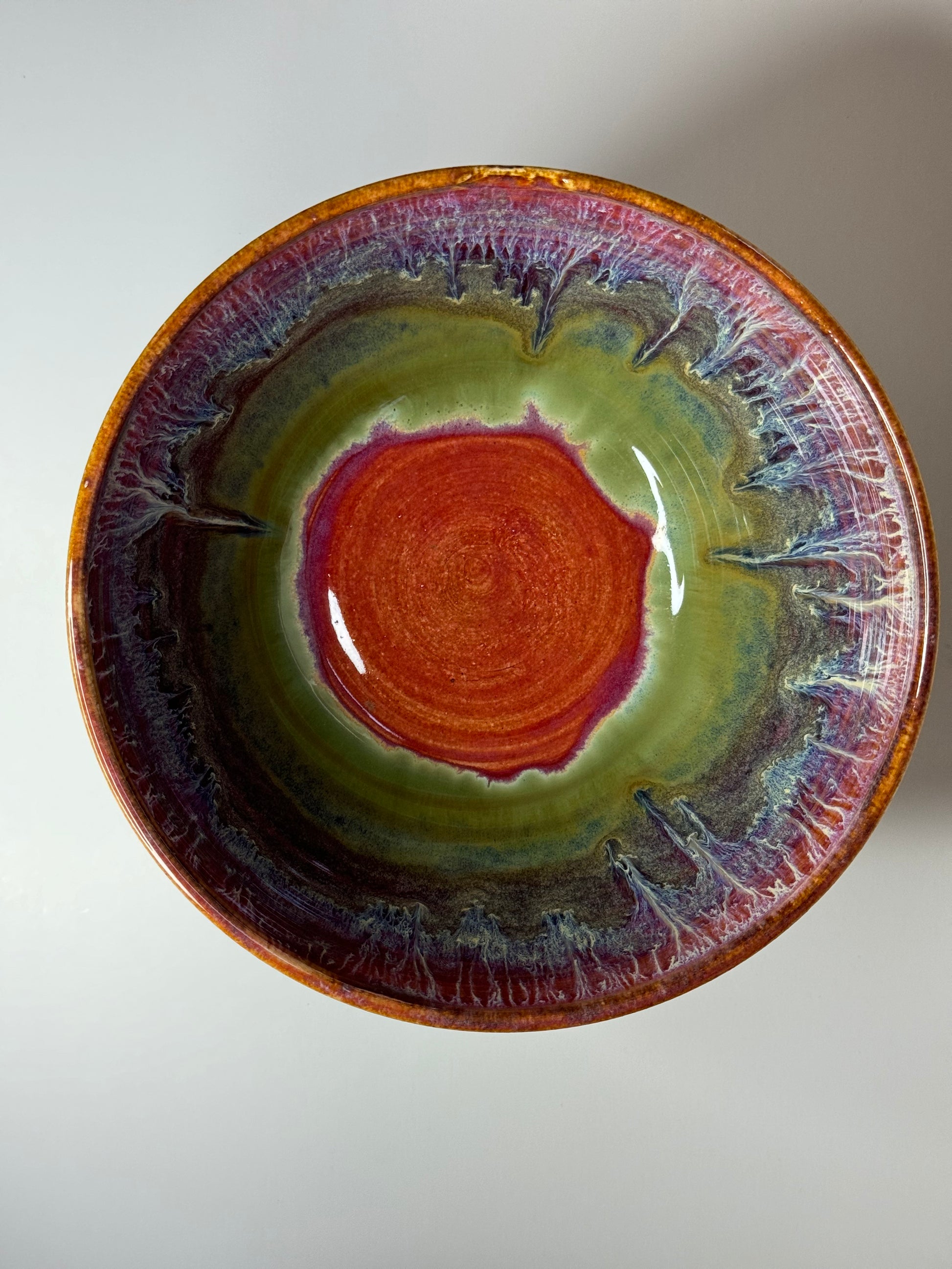 Add a touch of artistry to your home with this one-of-a-kind handcrafted ceramic bowl. The bowl features a mesmerizing multicolor glaze design with cascading patterns of rich reds, purples, greens, and blues. Each piece is uniquely crafted, ensuring no two bowls are alike.