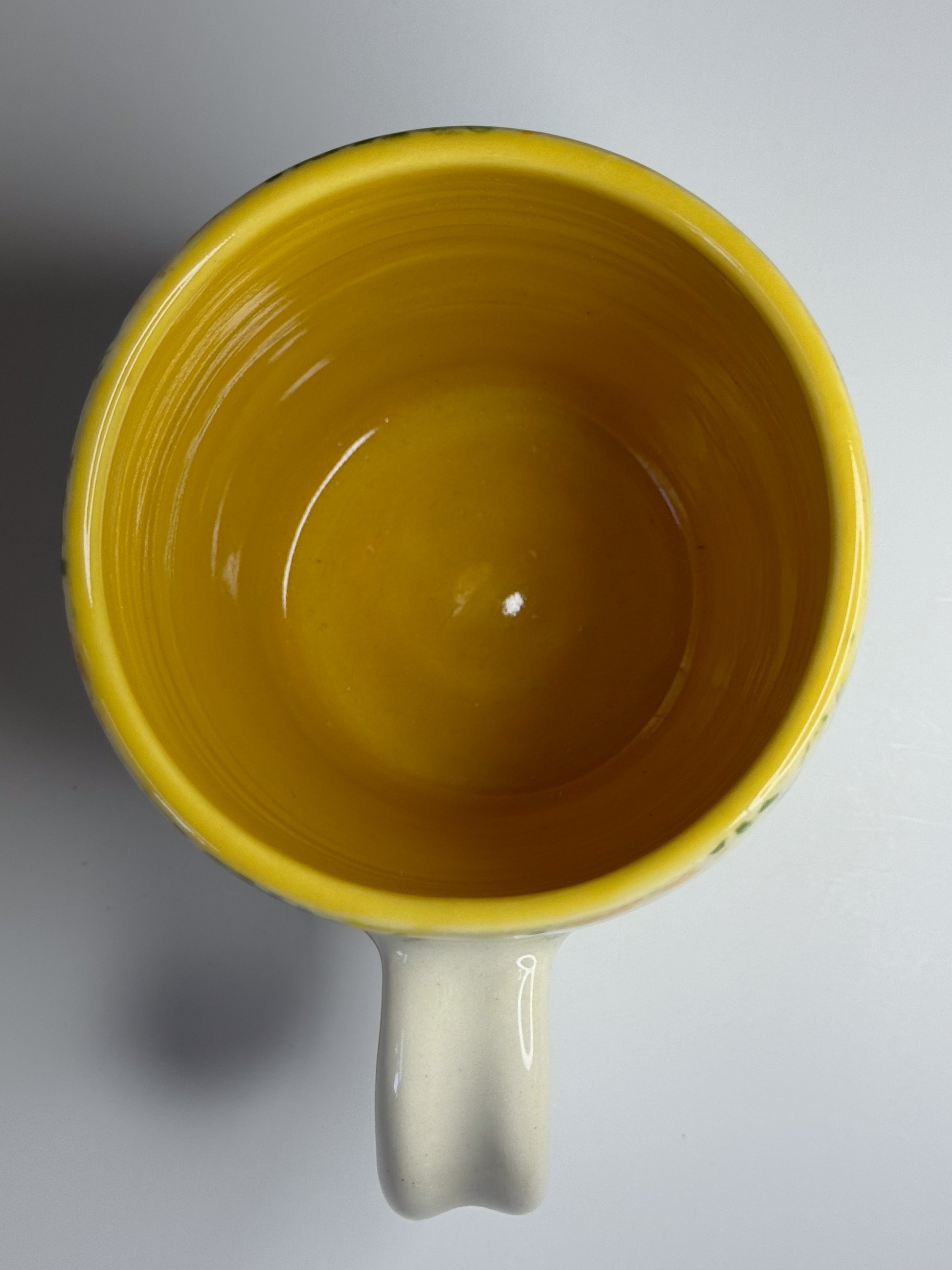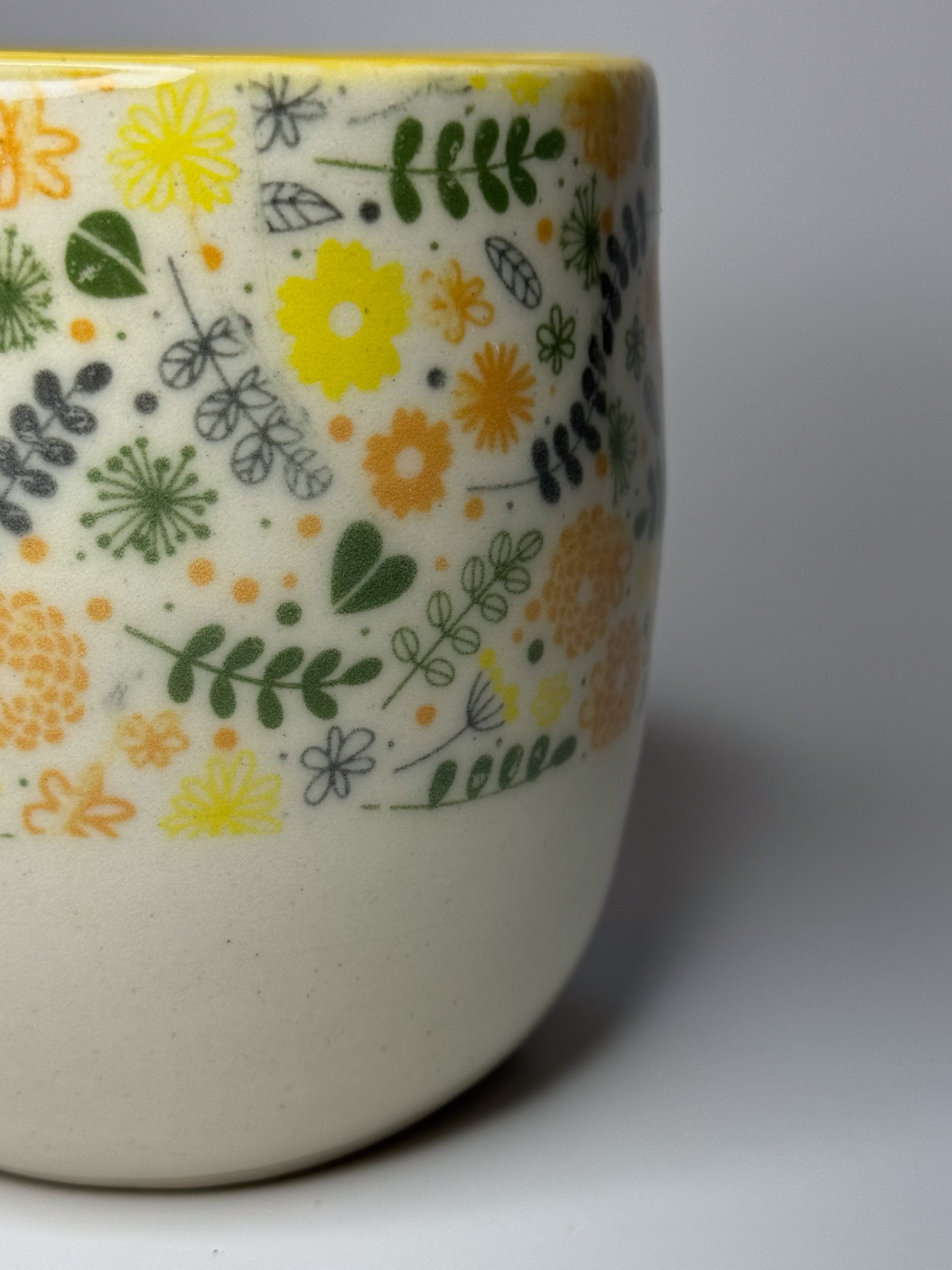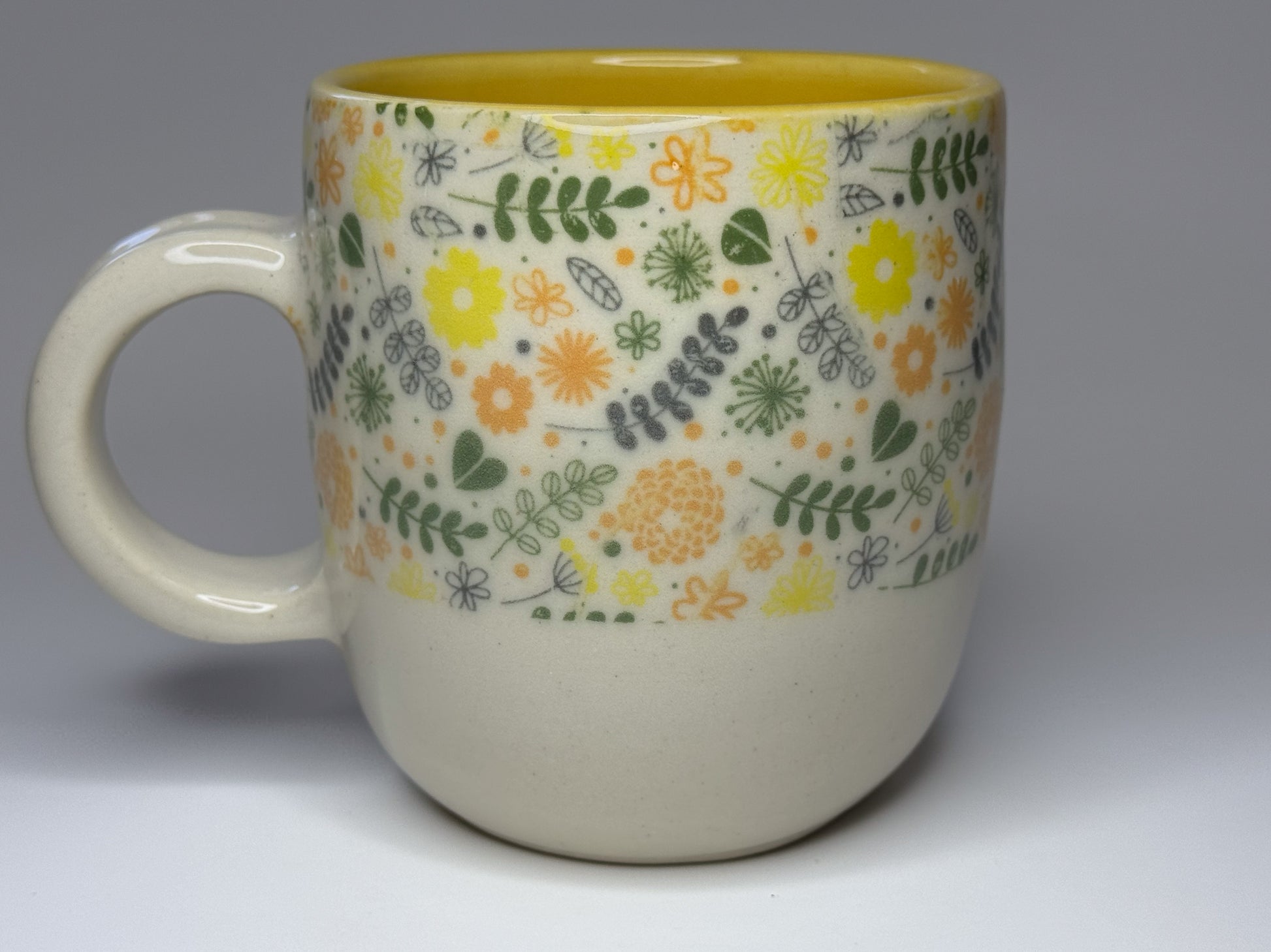 - Finish: Printed floral transfer paired with transparent and yellow glaze.